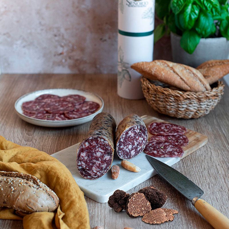 We carefully select the proportions of the ingredients from the best artisan sausages, which were made in the traditional slaughterhouses of southern Extremadura and whose formulas are now kept as one of our main assets. In addition to black pepper and nutmeg as the main spices of traditional salchichón, a new truffle touch is incorporated that gives it character and a unique flavour, designed for truffle lovers looking for intense flavours.